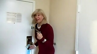 Transsexual cougar Sofia Sanders pokes young guy in mouth and anus