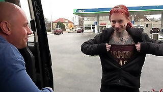 Fully Pierced and Tattooed Wierd Creature Rock the Cock in Driving Car