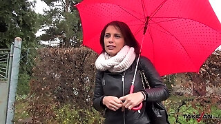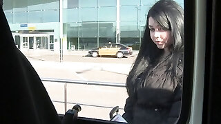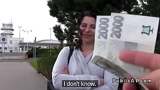 Brunet big-boobed stranger gives a blowjob and gets fucked for cash