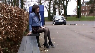 Naughty tranny enjoys public flashing and foot handballing in Paris