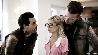 Petite blonde in glasses Piper Perri gets facial cumshot after gonzo gangbang