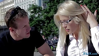 Nerdy platinum-blonde in glasses gets messy facial after sex with stranger guy