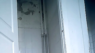 White blondie in the shabby rest room room getting filmed on spycam