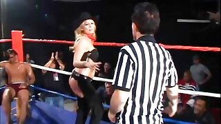Sizzling busty beauty undresses for judges on the podium